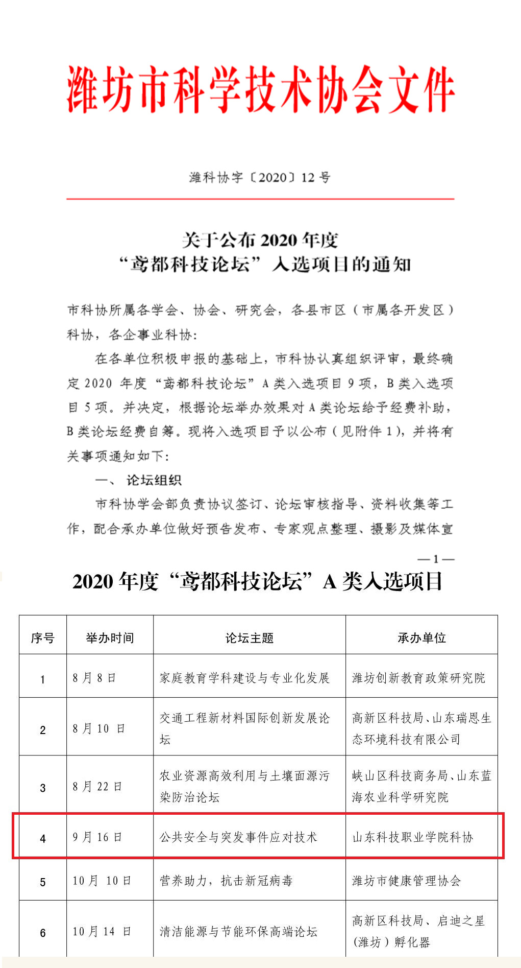 日前,潍坊市科学技术协会发布《关于公布 2020 年度“鸢都科技论坛”入选项目的通知》,学院申报的“公共安全与突发事件应对技术”入选2020年度“鸢都科技论坛”A类(经费补助类)项目,学院成为9个入选A类项目的唯一一所高等院校。