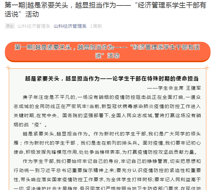 无私无畏,担当作为,以“勇”立德。疾风知劲草,烈火炼真金。紧急关头、危难时刻,师生党员、学生干部和入党积极分子争先请战,积极投身到学院、社区、农村防疫一线志愿服务中去。他们冲锋在一线,协助防疫人员做好消毒、防疫知识宣传等防疫工作,为疫情防控增设一道屏障。在团总支和学生会组织下,全系学生通过多种方式讴歌战疫英雄,声援全国抗疫斗争,营造了浓厚的疫情防控舆论氛围。