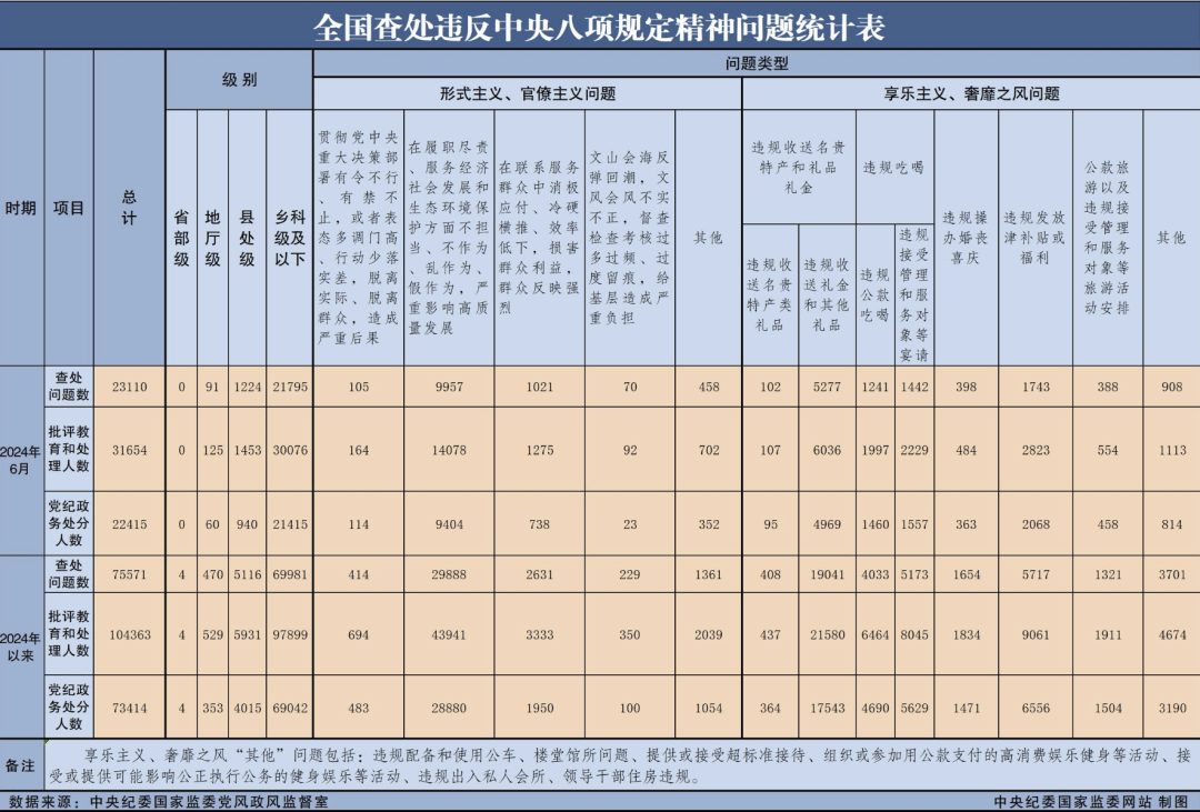 7月25日,中央纪委国家监委公布了2024年6月全国查处违反中央八项规定精神问题汇总情况。当月,全国共查处违反中央八项规定精神问题23110起,批评教育和处理31654人,其中党纪政务处分22415人,这是连续第130个月公布月报数据。