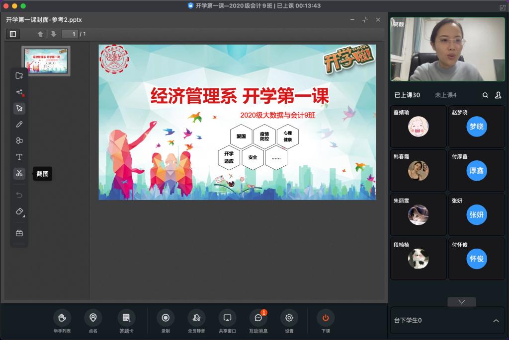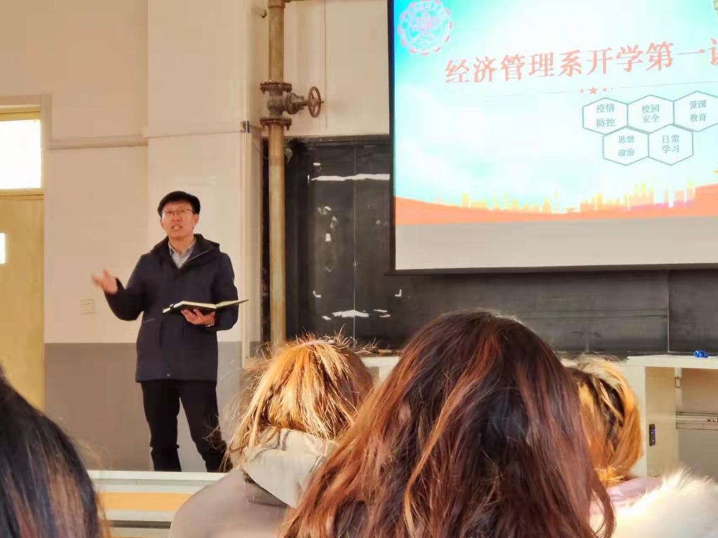 根据学院春季开学的工作要求,tyc7111cc太阳成集团于2月20日组织开展 “开学第一课”活动,本次活动由各专兼职辅导员老师主讲,经管系全体学生参加。