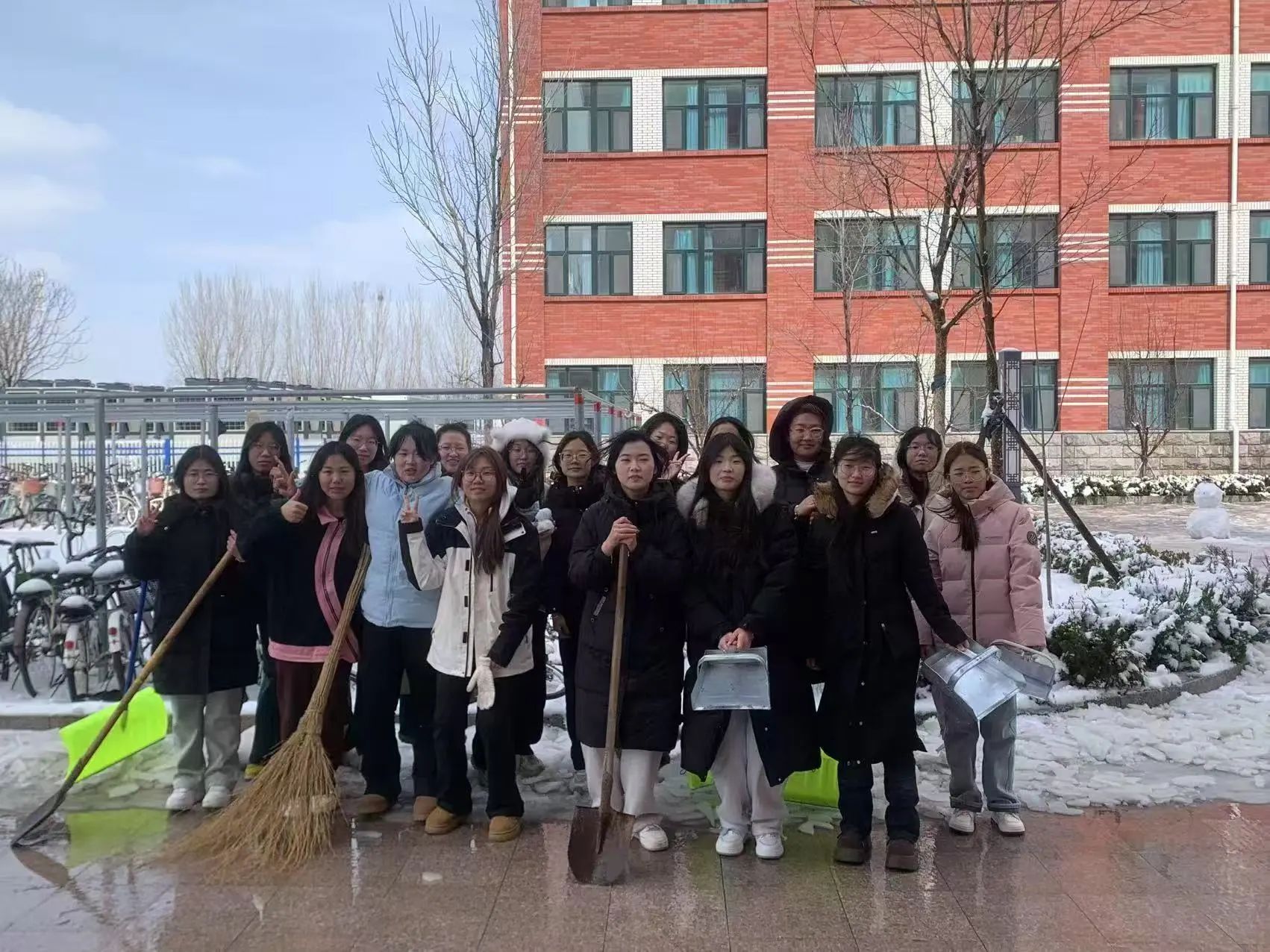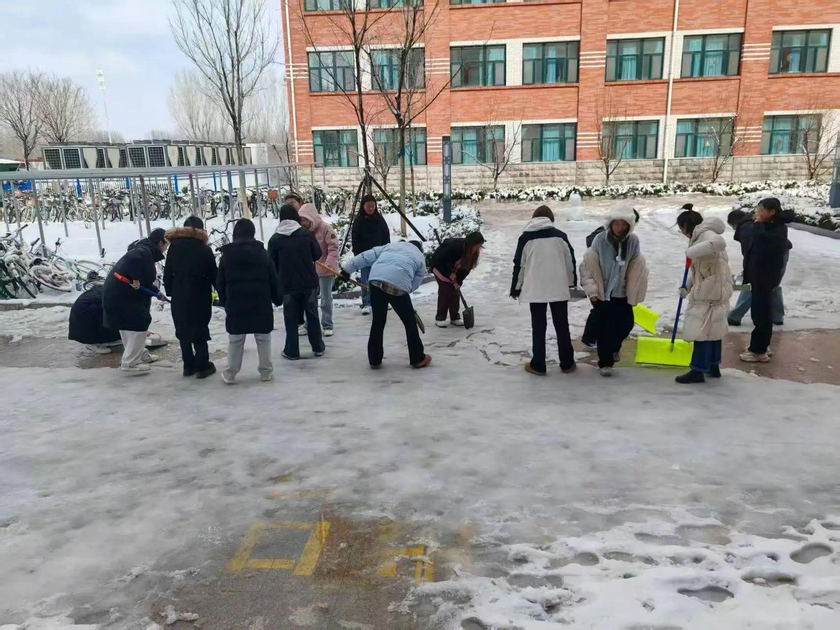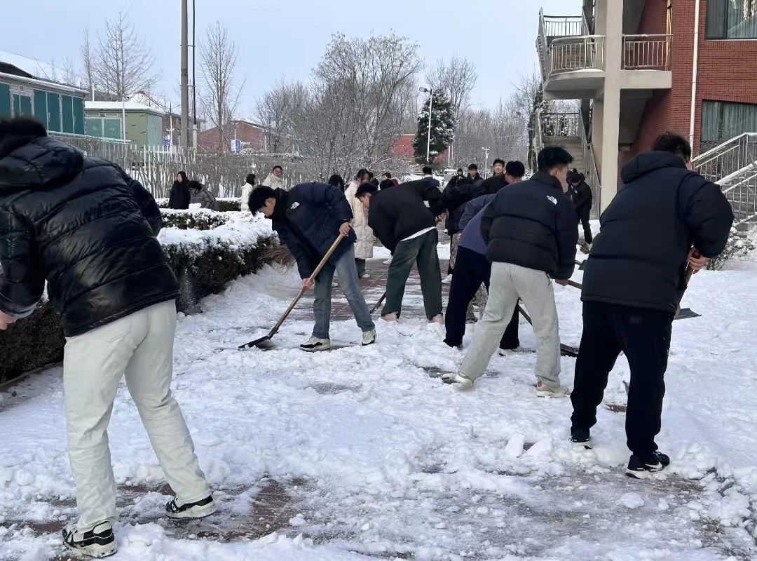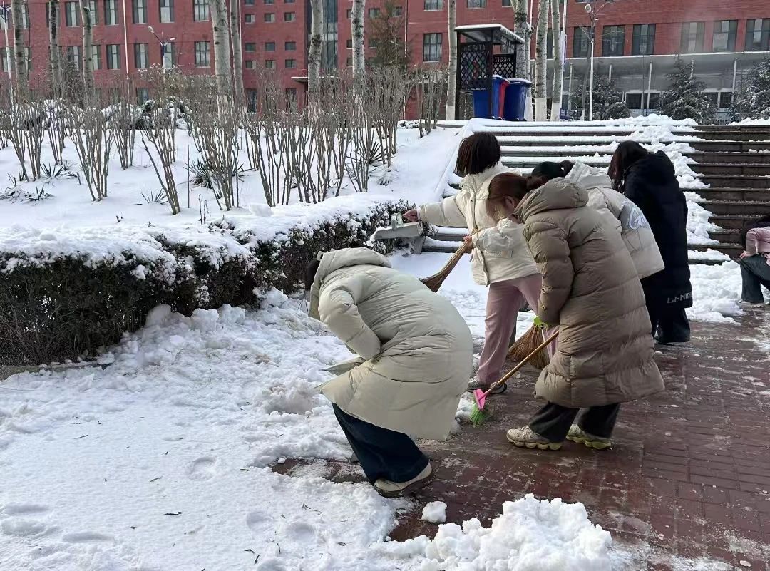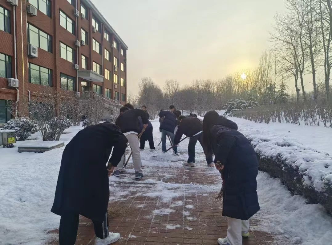 雪情就是号召,行动彰显担当。面对雪情,我系党总支第一时间启动应急预案。早上七点,同学们准时到达清扫现场,热情高涨,干劲十足。零下低温中,铁锹与冰面碰撞的清越声响彻校园。他们挥舞着铁锹、扫帚,相互配合,将积雪清理到路边。同学们充分发扬不怕苦、不怕累的服务精神,经过一个多小时的共同努力,笃志楼到公寓楼的积雪和坚冰基本被清扫干净,同学们用汗水浇灌出一条温暖的“安全防线”。