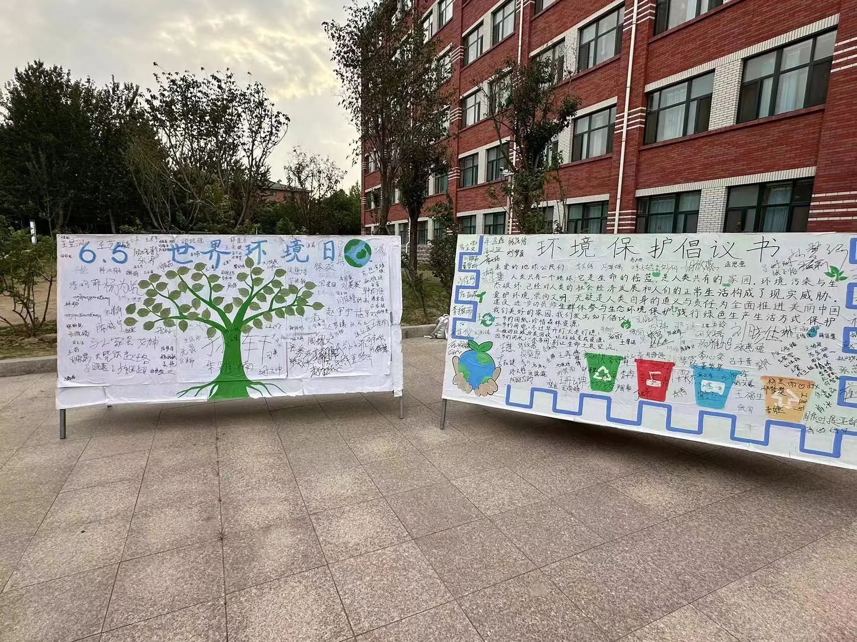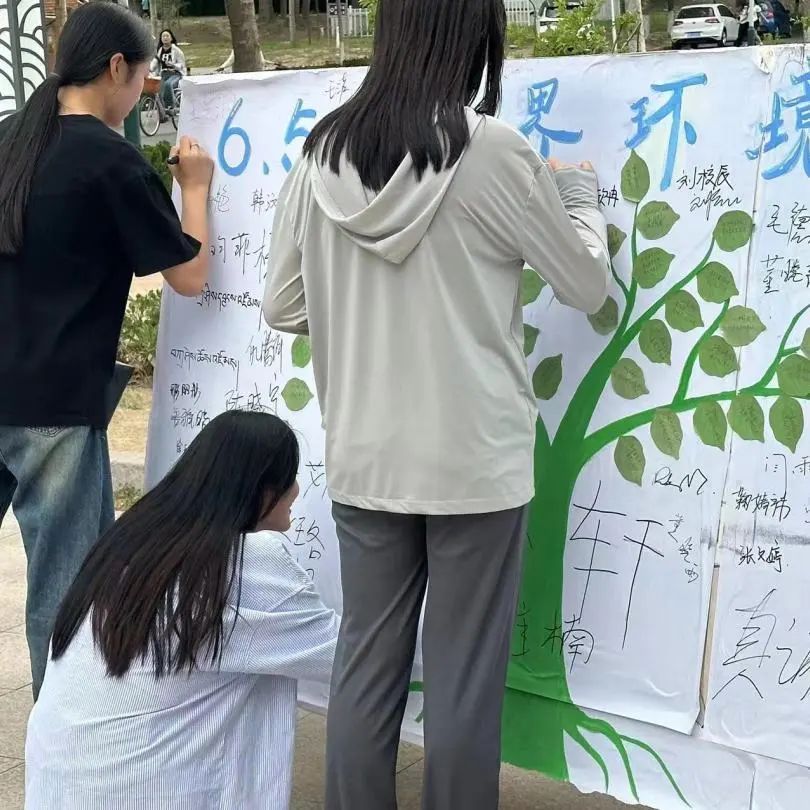 此外,我系在20号学生公寓“一站式”学生社区南门口开展“建设人与自然和谐共生的现代化”主题签名活动。活动现场设置了环境保护知识展板,同学们领取属于自己的树叶便签后,挑选主题寄语,贴在展板树枝上,让大树变得茂盛起来。这一举动让同学们深入理解节能低碳的内涵,传播了生态环保理念。