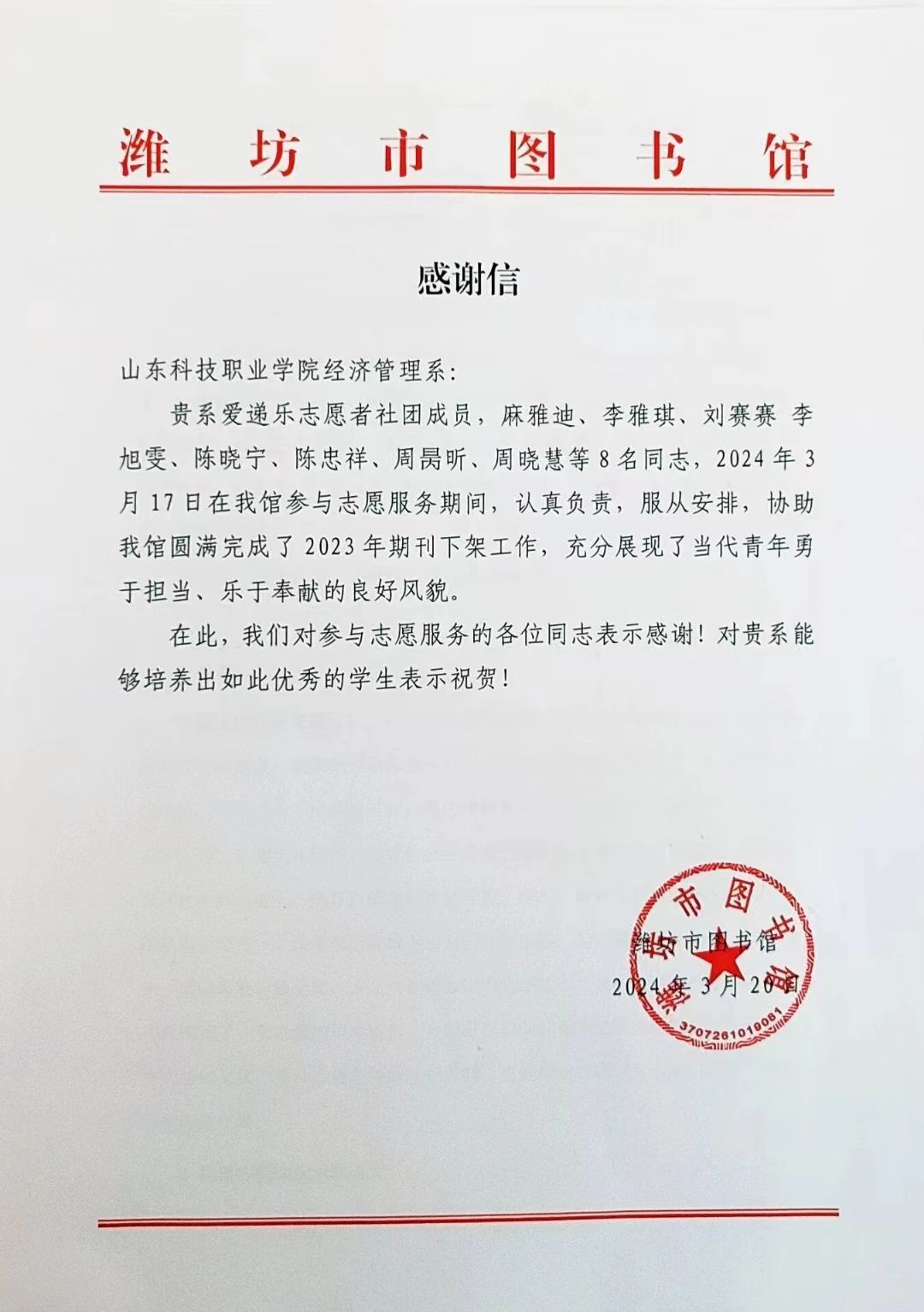 近日,tyc7111cc太阳成集团收到潍坊市图书馆发来的感谢信。信中表示,我系爱递乐志愿者社团成员,麻雅迪、李雅琪、刘赛赛、李旭雯、陈晓宁、陈忠祥、周昺昕、周晓慧等8名同志,2024年3月17日在潍坊市图书馆参与志愿服务期间,认真负责,服从安排,协助图书馆圆满完成了2023年期刊下架工作,充分展现了当代青年勇于担当、乐于奉献的良好风貌,受到了潍坊市图书馆领导、工作人员和读者的一致好评,为社会公益作出了积极贡献。