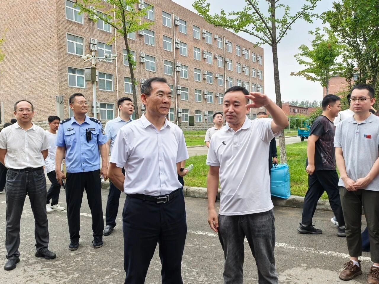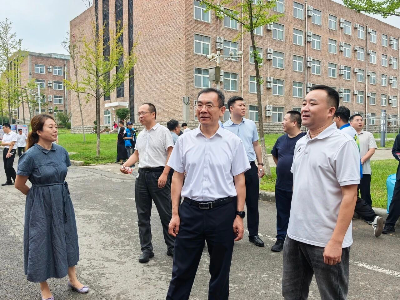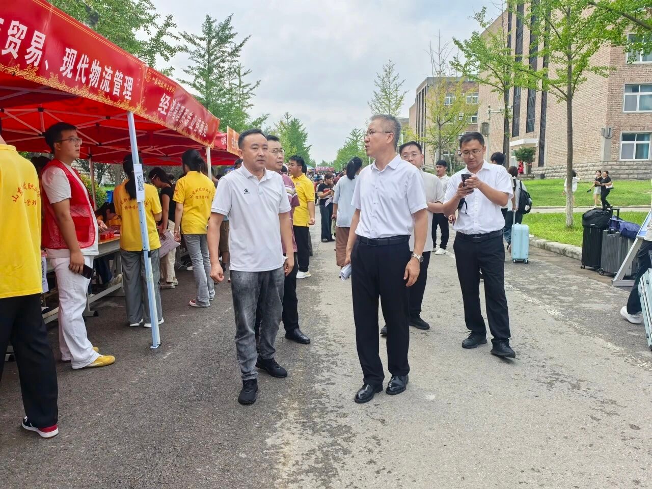 校领导来到新生工作区域视察,关切询问新生需求,检查迎新服务细节,要求做好各项保障,让新生感受校园温暖。