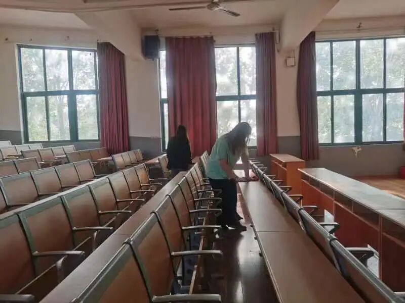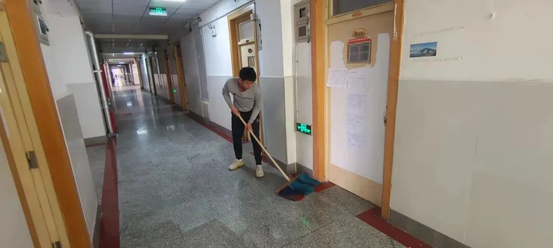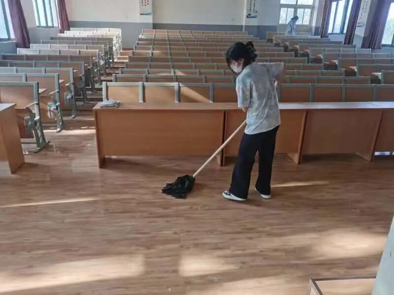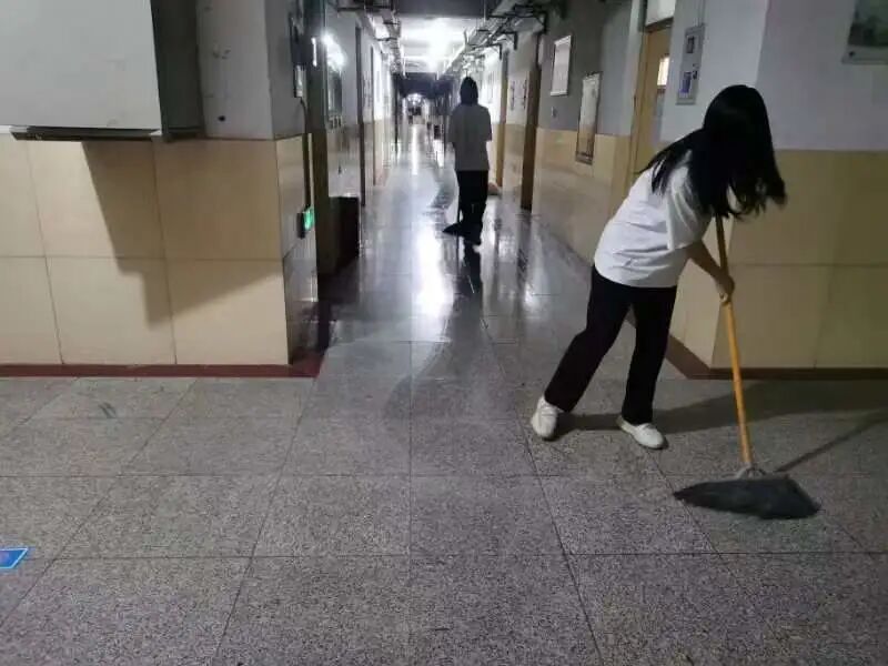 打扫问辩楼教室卫生的志愿者们用拖把清理一层至四层的每个教室以及走廊,用抹布擦拭教室的桌子以及窗台;打扫宿舍公寓走廊的志愿者分为两组,一组志愿者负责清理堆在宿舍走廊的垃圾,另一组志愿者使用扫帚以及拖把打扫卫生。