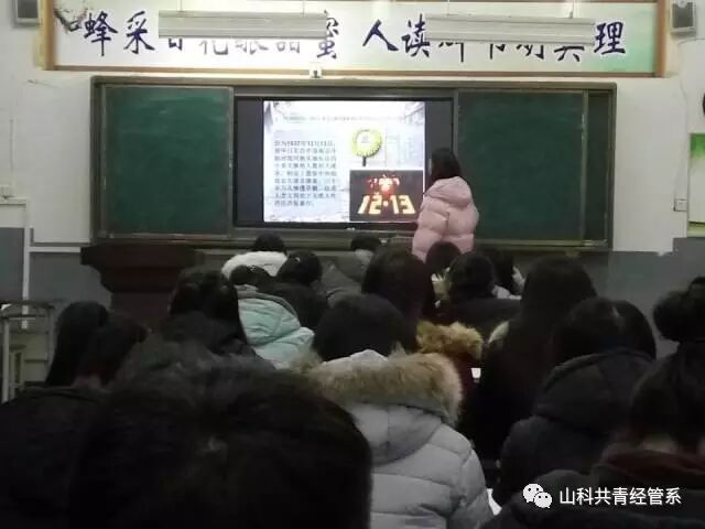 活动伊始,同学们全体起立,随着伴奏一起歌唱国歌,继而观看南京大屠杀历史讲解PPT,《血海金陵》、《尸山记录》等相关视频。视频在放映期间各教室全场肃穆安静,气氛沉重而严肃。当银幕上播放着一幕幕黑白色调为主的屠杀场面和二战期间受苦受难的同胞被残害和被奴役的场景时,同学们眼里饱含泪水,30万同胞在战争中突然撒手人寰,瞬间阴阳相隔,即便是普通老百姓,也能感同身受,内心为之一动。生命只有一次,30万同胞无辜逝去,他们理应和抗战英雄一样,值得我们每个人去追忆。国家主席习近平同志曾说,历史不会因时代变迁而改变,事实也不会因巧舌抵赖而消失。为南京大屠杀死难者举行公祭日,是要唤起每一个善良的人们对和平的向往和坚守,而不是要延续仇恨。 我们要以史为鉴、面向未来,共同为人类和平作出贡献!