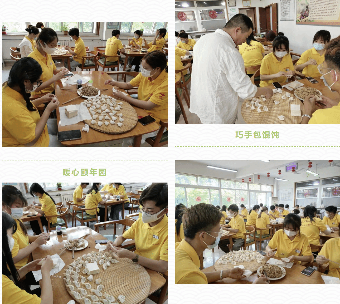 上午8:30,志愿者们来到了颐年园敬老院。志愿者们在颐年园负责人的引领下,首先进入大厅和老人们亲切交谈,询问其最近的身体情况以及生活状态。然后有序的进入后厨,志愿者们每三人分为一组,经过后厨人员亲自示范包馄饨的手法之后,开始了包馄饨之旅。在活动过程中,志愿者们相互学习以及讨论包馄饨的技巧,你一言我一语整个颐年园被欢声笑语所包围。看着盘子上的一个个花儿似的馄饨,志愿者们在心里也开出爱老敬老服务之花。活动结束后,志愿者们主动收拾剩余面皮以及馅料,并帮助工作人员打扫卫生。