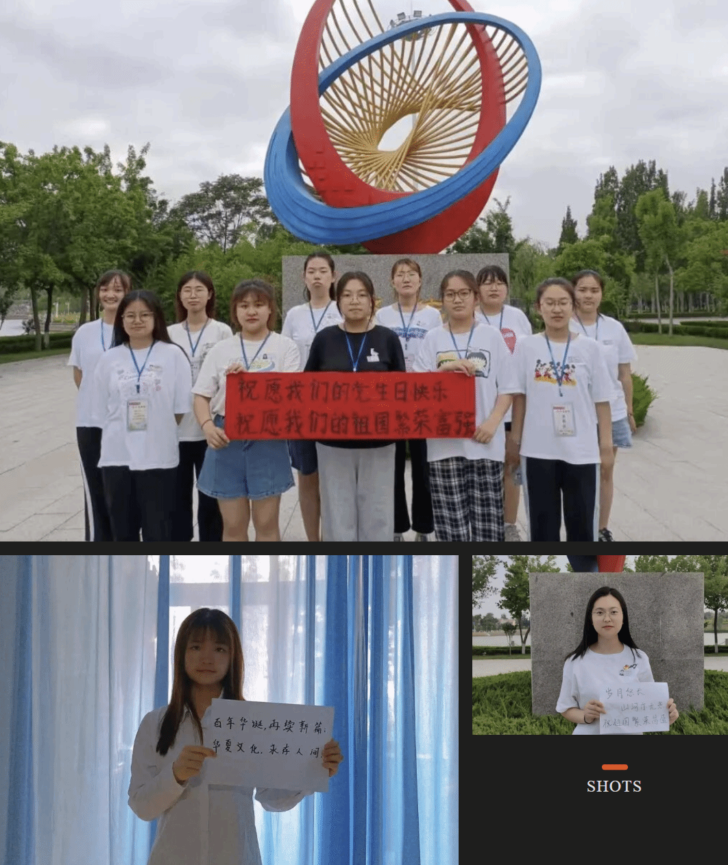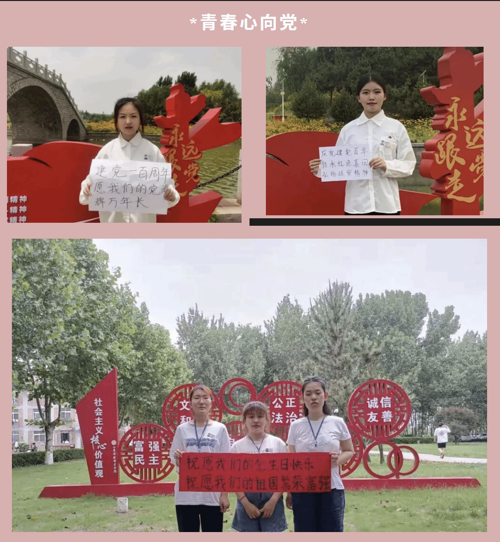 本次活动是通过收集同学们手握一百周年祝词照片的形式展开。图片中同学们身着白色衬衣佩戴团徽,嘴角微微上扬,手握本次活动的祝词,用饱满热情的神态,叙述着对建党一百年来呕心沥血的敬畏,展现新时代青年人积极向上的精神风貌和拳拳爱国之心,表达对党,对祖国,对美好生活的热爱之情。通过这种形式来激励当代大学生应肩负起新时代的职责与使命。