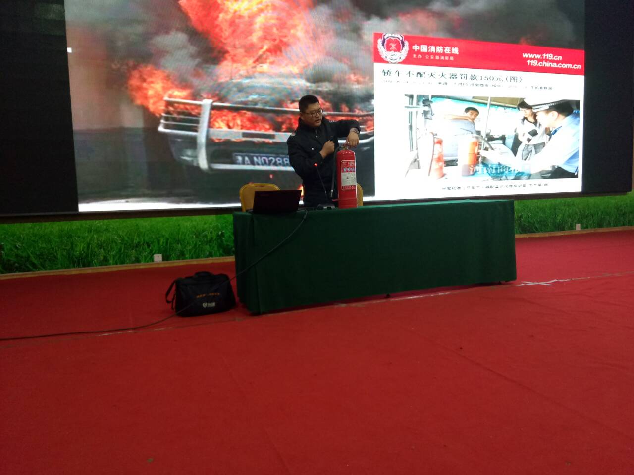 讲座中,王建朋教员向同学们讲述了消防基础知识、学校防火知识以及防火预防、火灾现场自救逃生等基础常识,并列举了大量事例。随后,王建朋教员向大家详细介绍了几种常见灭火器的使用方法,并依步骤演练,为大家普及了火灾发生初期自救、抢险的科学方法,提醒每名大学生要主动学习消防安全知识,掌握基本的火灾逃生技能。